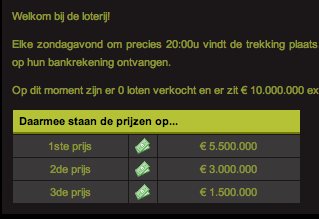 Welkom bij de loterij! Elke zondagavond om precies 20:00u vindt de trekking plaats. De winnaars zullen hun gewonnen bedrag automatisch op hun bankrekening ontvangen.